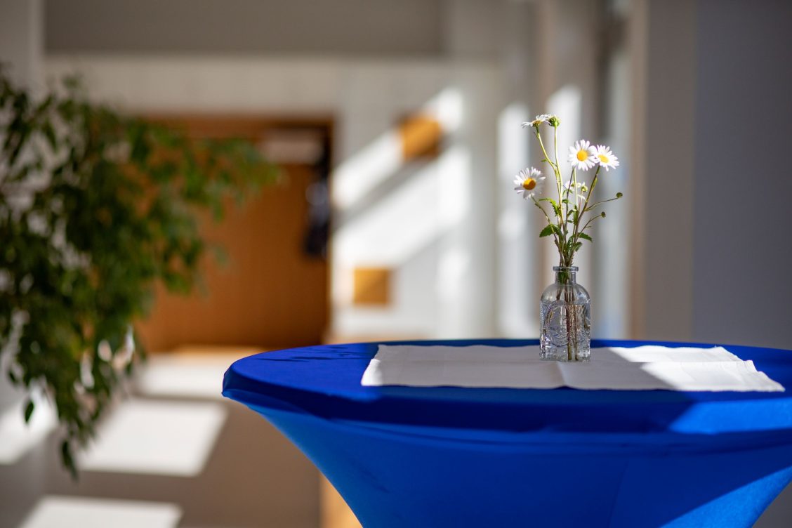 Der großzügige Saal lässt sich flexibel gestalten und bietet Mobiliar und Geschirr für bis zu 200 Personen. Ob Tagung mit klassischer Bestuhlung, Workshop mit Gruppenaufstellung oder festlicher Empfang – der Raum lässt sich individuell an Ihre Bedürfnisse anpassen. Das angrenzende Foyer mit Tresenbereich eignet sich hervorragend für den Gästeempfang oder informelle Pausen, während die Garderobe mit abschließbaren Fächern Komfort und Sicherheit bietet.